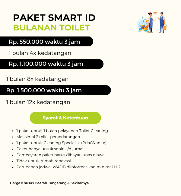 Kami adalah layanan kebersihan profesional yang menyediakan solusi pembersihan efisien dan tanpa ribet. Dengan dukungan tim staf terlatih dan berpengalaman, kami menawarkan berbagai pilihan layanan pembersihan, termasuk pembersihan harian, mingguan, bulanan, serta layanan pembersihan khusus. Kami melayani beragam jenis properti, mulai dari rumah tinggal, apartemen, kantor, restoran, hingga berbagai fasilitas lainnya.